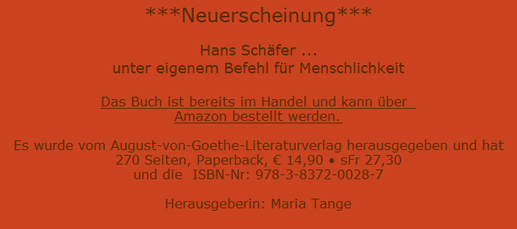 Hans Schäfer mit seinen vorliegenden bewegenden Aufzeichnungen will erinnern und nachfolgende Generationen zur Wachsamkeit, sowie gewaltlosem Widerstand gegen jede Art inhumaner Vorgehensweise aufrufen.